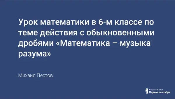 Одной из тенденции современного образования является установление межпредметных связей изучаемых дисциплин. Предлагаемая разработка урока «Математика – музыка разума» в 6-м классе по теме «Действия с обыкновенными дробями» позволяет не только обобщить и систематизировать материал, но и установить связи между двумя, на первый взгляд не имеющими ничего общего, дисциплинами – математикой и музыкой. В содержание разработки включены задания, способствующие, по мнению авторов учебников математики, расширению математических знаний, построению логических цепочек на основе рассуждений, наблюдений.