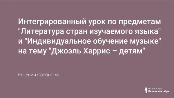 Данный урок знакомит с творчеством американского писателя Джоэля Харриса, создателя знаменитых "Сказок дядюшки Римуса", и музыкальными произведениями известного фольклориста Эли Сигмейстера. А также развивает креативные способности учащихся при инсценировании одной из сказок с музыкальным сопровождением.