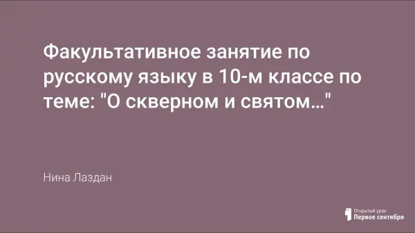 Русский язык - явление уникальное: в нём уживаются и тесно переплетаются и скверное, и святое. Сквернословие стало нормой жизни. Примерно половина опрошенных подростков употребляет нецензурные слова и выражения, придерживаясь правила: как все, так и я. 30% обучающихся убеждены: раз есть в языке матерные слова, значит, их можно употреблять. Можно ли всё-таки употреблять нецензурные слова и выражения? Что представляет собой сквернословие как языковое явление? Верно ли утверждение Э. Асадова о том, что "слово "мат" идёт от слова "мать", сквернейшее - от самого святого!"? Что мы можем противопоставить "языку подонков и блатарей"? Этим вопросам посвящено факультативное занятие по русскому языку в 10-м классе "О скверном и святом".
