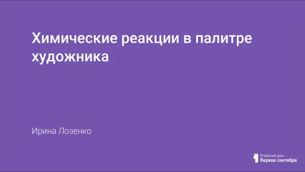 Урок "Химические реакции в палитре художника" разработан как обобщающий по теме "Химические реакции", 9-й класс. В ходе урока учащиеся получают знания о применении химических веществ и реакций в искусстве, рассматривают химическую науку как источник материальной культуры. Учащиеся знакомятся с некоторыми пигментами красок, отрабатывают навыки написания уравнений химических реакций в ионном виде, окислительно-восстановительных реакций, закрепляют умения решать задачи и сразу имеют возможность увидеть "результат своего труда" - картины великих живописцев прошлого, в написании которых применялись те или иные краски.