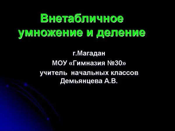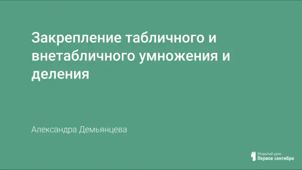 Урок проведён для учителей кафедры начального обучения. Урок проводился как обобщающий во 2-м классе 4-й четверти. Ученики изучают способы внетабличного умножения и деления, а затем был проведён данный урок с целью обобщения и коррекции знаний учащихся по данной теме.