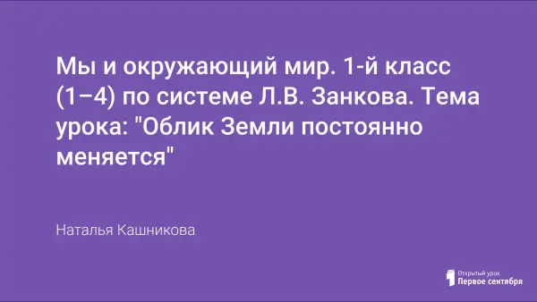 Тема урока "Облик Земли постоянно меняется" сложная для 1-го класса, поэтому дидактическим стержнем урока является материал, направленный на поиск. Главным этапом урока будет моделирование современного облика Земли, работа с дидактическим материалом. Начало урока в занимательной форме способствует самим учащимся определить тему урока и его цели. Последний этап позволяет закрепить, а также проверить знания учащихся, полученные на уроке. В урок включен краеведческий материал, а в заключение - стихотворение на экологическую тему.