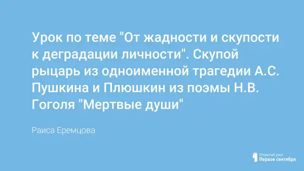 Скупой рыцарь, из одноименной трагедии А.С. Пушкина и Плюшкин, из поэмы Н.В. Гоголя "Мертвые души". Что объединяет их?
