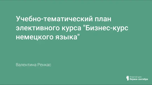 В целях организации профильного обучения мною разработана и осуществляется программа элективных курсов "Бизнес-курс немецкого языка" для старшеклассников экономического профиля - групп "Бухгалтер" и "Коммерсант". Этот бизнес-курс включает в себя общеобразовательный базовый курс с профильной направленностью. Овладение основами делового немецкого языка - основными понятиями бизнеса, рыночной экономики и деловой коммуникацией - главная задача. Предлагаю учебно-тематический план и содержание программы данного элективного курса.