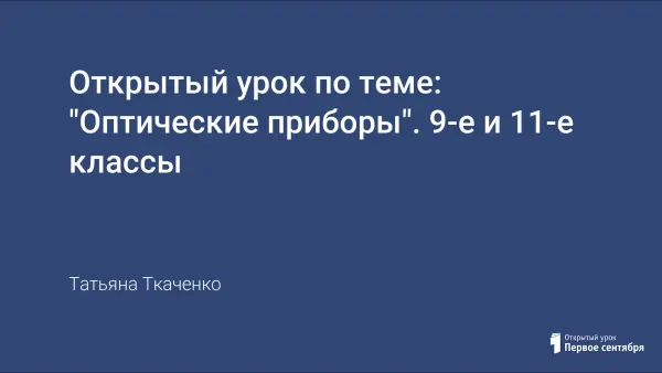 Открытый урок "Оптические приборы" является завершающим уроком при изучении темы "Геометрическая оптика" в 9-х и 11-х классах. Основными задачами такого урока являются: знакомство учащихся с принципами работы и устройством приборов через коллективную деятельность в группах, научить их грамотно, научно и доступно излагать свои мысли и знания по изучаемой теме, заинтересовать предметом, заставить каждого ученика проявить себя в подготовке такого урока в качестве исследователя, ученого, лектора, организатора или художника.