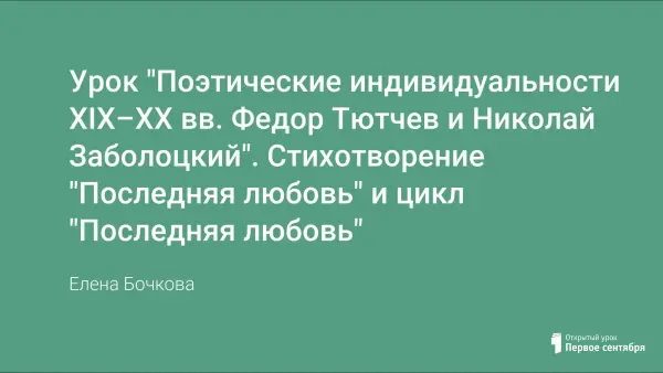 Данный урок позволяет учащимся обратиться к теме любви в творчестве поэта, когда они уже имеют представление об особенностях его художественного мира, что обеспечит более глубокое восприятие и его любовной лирики. Кроме того, обращение в связи с этим к поэзии Ф.И. Тютчева дает возможность не только вспомнить изученную в 10-м классе тему, но и глубже постигнуть поэтические индивидуальности Заболоцкого и Тютчева в их соприкосновении.