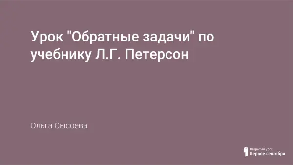 Урок разработан по учебнику Л.Г. Петерсон «Математика» для первого класса. Главной целью является введение понятия задачи, обратной данной; а также закрепление терминов, связанных с понятием «задача», навыков записи задачи, чтения и составления схем, навыков счёта в пределах 9; развитие речи, мыслительных способностей, памяти, внимания, аналитических и творческих способностей.