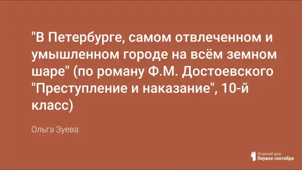 Изучение романа Ф.М. Достоевского «Преступление и наказание» уместнее начать с изучения темы Петербурга и его влияния на судьбы героев. При разработке урока акцент делался прежде всего на связь образа Петербурга с образом Петербурга его предшественников, на эволюцию этого образа в русской литературе. Одной из основных целей урока было показать учащимся особенности города «униженных и оскорбленных», средства его изображения, сходство и отличие образа Петербурга Достоевского с образом Петербурга в произведениях 1810-60-х годов. При этом одновременно учащиеся подводятся к осмыслению главного конфликта романа – конфликта между Раскольниковым и миром.