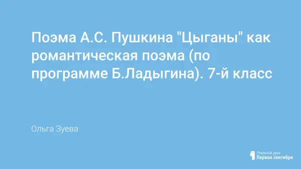 Урок посвящяется приемам раскрытия характера романтических героев, своеобразию разрешения проблемы человеческой свободы Пушкиным. Несомненным дополнением к уроку станут музыкальные записи и иллюстрации к поэме, которые помогут учащимся сопоставить литературный образ главных героев с музыкальным и художественным.