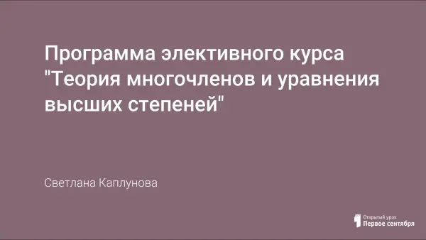 Данная программа предназначена для учащихся 9-го класса, стоящих перед выбором дальнейшего профиля обучения в старшей школе, и рассчитана на 27 часов. Содержание курса включает углубление тем базовой общеобразовательной программы, а также расширение по отдельным темам. Целью предлагаемого элективного курса является знакомство учащихся с основами теории многочленов, формирование представления о методах и способах решения нестандартных задач и алгебраических уравнений, создание ориентационной и мотивационной основы для осознанного выбора дальнейшего профиля обучения.