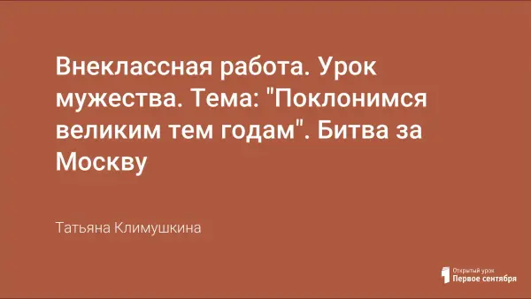 В год 60-летия Великой Победы особенно актуально проводить внеклассные мероприятия, направленные на создание образа войны, показывающие учащимся героизм и мужество защитников Отчизны. Примером служит легендарная Битва за Москву, которая явилась решающим событием первого года войны. Воспитание у детей чувства патриотизма и гордости за историю родной страны - главная цель, поставленная перед учителем.