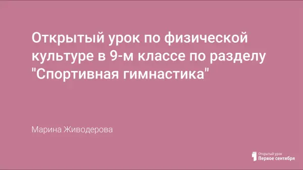 Конспект открытого урока по физической культуре в 9-м классе (девушки) по разделу спортивная гимнастика. Вводный урок. Задачи урока: укреплять здоровье, содействовать физическому развитию учащихся; обогащать учащихся специальными знаниями в области спортивной гимнастики; приобщать к самостоятельным занятиям физическими упражнениями; воспитывать эстетические, волевые, нравственные качества, прежде всего добросовестное отношение к учебным занятиям. Методы: поточный, групповой, индивидуальный.