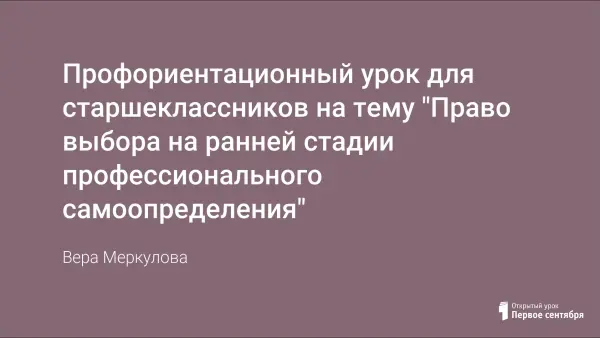 Выбор профессии ‒ очень важный момент в биографии человека, влияющим на все сферы жизни. Для старшеклассников право выбора на ранней стадии профессионального самоопределения ‒ главный вопрос развития. Его разрешение поможет им сориентироваться в выборе дальнейшего образования, определиться с будущей сферой профессиональной деятельности.