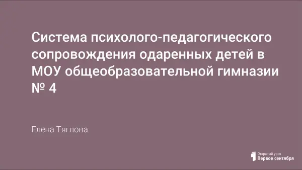 В работе представлена система работы педагогического коллектива гимназии № 4 с одаренными детьми. Результаты работы в данном направлении позволяют на протяжении ряда лет занимать гимназии лидирующие позиции в рейтинге среди образовательных учреждений Кировского района г. Красноярска.