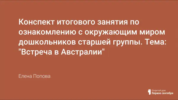 На данном занятии были обобщены знания детей о самом удивительном месте на Земле – Австралии: об особенностях неживой природы, животного и растительного мира, народонаселении континента; проведена параллель с особенностями живой и неживой природы европейского континента.
