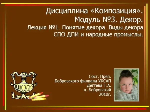 В работе автор делится опытом организации и реализации блока контроля на уроках студентов специальности «ДПИ и народные промыслы», дисциплина композиция.
