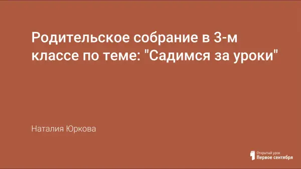Разработка родительского собрания для родителей учащихся 3-го класса (программа 1–4). Педагог стремится выявить представления родителей об организации учебной работы дома. Совместно с родителями старается сделать всё возможное, чтобы приготовление домашних заданий младшими школьниками было успешным. Предложены рекомендации о том, как формировать у детей навыки самоконтроля, умения работать самостоятельно.