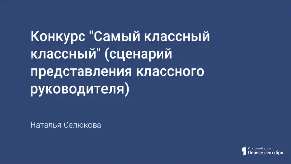 В рамках городских и школьных конкурсов представляются разного рода самопрезентации, где в течение отведенного времени учитель рассказывает о своих достижениях, успехах, проблемах. Данный сценарий может быть представлен в рамках конкурса "Самый классный классный!". Конкурс проводится с целью выявления талантливых классных руководителей; знакомства с профессиональным мастерством и творчеством; выявления позиции в воспитании; обоснования педагогических ориентиров в работе с классом; определения индивидуальности, отношения к детям; представления достижений своего коллектива; перспектив работы.