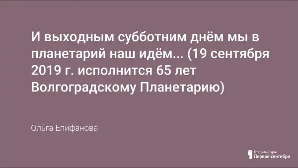 19 сентября 2019 года исполнится 65 лет Волгоградскому Планетарию. И его прекрасное здание, и его уникальное оборудование являлись подарком трудящихся ГДР к 70-летию И.В.Сталина. За эти годы Планетарий стал любимым местом проведения досуга для многих поколений взрослых и детей Сталинграда-Волгограда. В содружестве с музыкантами и артистами объединения “Волгоградконцерт”, лекторы Планетария ищут и успешно находят новые формы работы: концерты, спектакли и др. Мы поздравляем наш Планетарий!