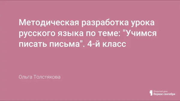 Урок достигает поставленной цели лишь тогда, когда, кроме получаемой информации, дети осознают способность творить, возможность раскрыть свои чувства, личное значение в обществе, возможность своего позитивного влияния на окружающих людей. Предлагаемый вашему вниманию урок русского языка знакомит учеников 4-го класса с понятием эпистолярного жанра, правилами и основами написания письма. Процесс написания письма – это, несомненно, творческая работа, построенная на знаниях речевого сложения, орфографии, лексики и т.д.
