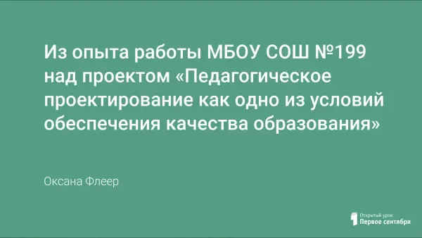 Проект «Педагогическое проектирование как одно из условий обеспечения качества образования в МБОУ СОШ №199» описывает механизм педагогического проектирования с целью организации проектной деятельности обучающихся в МБОУ СОШ №199 г.Новосибирска.