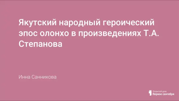Урок посвящен творчеству известного якутского художнику Т.А. Степанова, воссоздавшего в своих картинах загадочный и таинственный мир якутского народного героического эпоса олонхо. Материалы могут быть использованы на уроках литературы, МХК, изобразительного искусства.
