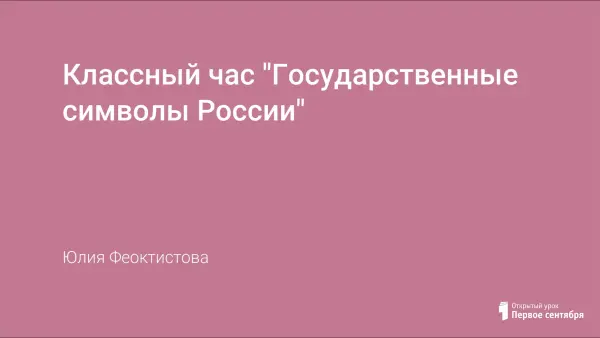 Классный час проводится с целью расширения знаний и представлений учащихся о государственной символике и преемственности в ней; популяризации государственных символов РФ и осознания их роли и значения; развития познавательных способностей; формирования гражданской позиции, национально-нравственных устоев; воспитания уважения к символам государства.