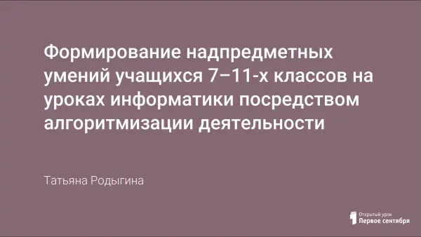 В описании опыта представлена система работы по формированию надпредметных умений у учащихся 7–11-х классов через составление алгоритмов деятельности при решении учебных и практических задач на уроках информатики. Перечисленные в работе формы, методы и приёмы не являются полным перечнем дидактических единиц, применяемых автором на уроках, но они наиболее чётко работают над формированием надпредметных умений в создании алгоритмов деятельности любой поставленной задачи.