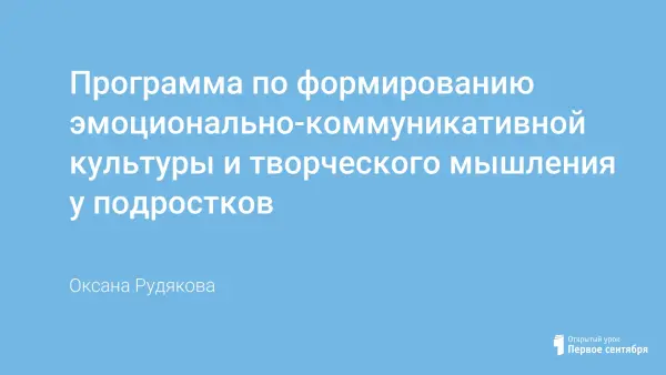 Представленное исследование было направлено на создание программы внеклассного взаимодействия, которое способствовало бы реализации потребности подростков в общении и носило бы позитивный, творческий характер, способствовало развитию у них творческого мышления, приобретения умений адекватного и равноправного взаимодействия, способности к предотвращению и разрешению межличностных конфликтов, эмоциональной устойчивости, саморегуляции.