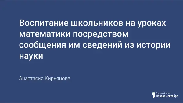 Практика работы с историей математики показывает, что именно при помощи истории науки, которая методически правильно включена в урок, можно сформировать у учащихся представлений о математике как части общечеловеческой культуры. Считаем, что история математики обладает огромным воспитательным воздействием на подрастающее поколение. При сообщении ученикам истории науки у них формируются внушение потребности к труду, ответственность за порученное дело, высокая нравственность, развивается научное любопытство.