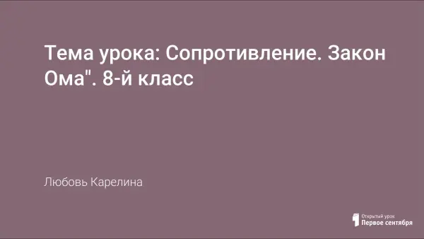 Урок изучения нового материала. На уроке использован видеофильм "Школьный физический эксперимент" (СГУ). Повторение силы тока и напряжения, введение понятия о сопротивлении. Устанавливается взаимосвязь между величинами в виде закона Ома.