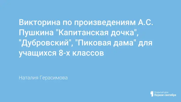 Викторина по литературе проводится по типу телевизионной игры "Умницы и умники". Она способствует формированию у учащихся внимательного отношения к детали в художественном произведении, к её роли в идейно-образной структуре. Викторину можно провести на обобщающем занятии по творчеству А.С. Пушкина, можно в форме диагностического контроля перед непосредственным изучением произведений А.С. Пушкина.