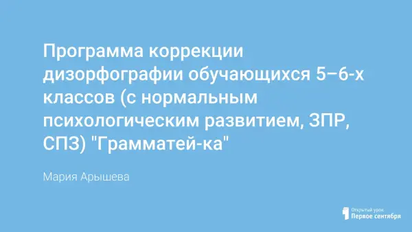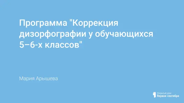 Программа "Коррекция дизорфографии у обучающихся 5-6 классов" предназначена для проведения коррекционно-развивающих занятий с обучающимися 5-6 классов, имеющих нарушение письменной речи. Программа направлена на обучение грамотному письму посредством самостоятельного определения на письме орфограмм и решения необходимых для этого орфографических задач.