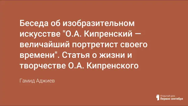 Беседа об искусстве включает ознакомление с произведениями русского изобразительного искусства. Рассказ о жизни и творчестве великого русского художника О.А. Кипренского можно использовать на специальных уроках-беседах об искусстве, на которых учащиеся знакомятся с основами отечественного искусства.