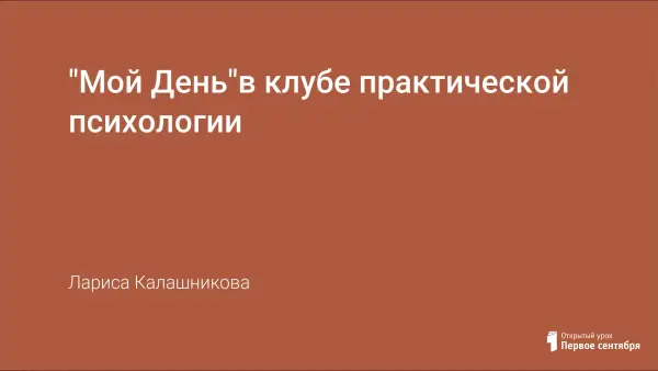 "Мой День" в клубе практической психологии для старшеклассников - это занятие, в фокусе которого оказывается личность одного участника. Это предоставляемая ему возможность самопрезентации на разных уровнях общения и разными средствами, получения обратной связи от сверстников в группе. Главная цель занятия - включение новых представлений о себе в образ "Я", создание мотивации саморазвития. Личностно-ориентированный характер занятия обеспечивается через поиск "образа Дня", оформление помещения и через использование соответствующих методов психологического тренинга.
