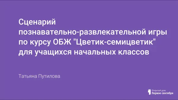Игра- путешествие по курсу ОБЖ " Цветик-Семицветик" для учащихся начальной школы. При помощи различных детских произведений ребята побывают в разных странах, где герои нарушают правила безопасности жизнедеятельности при пожаре, пользовании лекарствами и предметами бытовой химии, встрече с незнакомцами, на улицах города, в лесу, на воде.