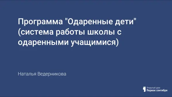 Проблема работы с одаренными учащимися чрезвычайно актуальна для современного российского общества. Массовая школа сегодня сталкивается с проблемой раннего выявления и развития способностей ученика. Жизнь требует от школы подготовки выпускника, способного адаптироваться к меняющимся условиям, коммуникабельного и конкурентоспособного. Цель предлагаемой программы - обеспечить возможности творческой самореализации личности в различных видах деятельности через создание системы внеурочной работы, дополнительного образования учащихся, организацию исследовательской работы учащихся.