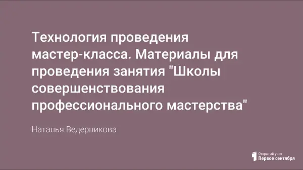 В статье представлены материалы для проведения занятия «Школы совершенствования профессионального мастерства» по теме «Технология проведения «Мастер-класса». Материал разработан на основе публикаций и представляет собой методическую разработку рекомендательного характера для педагогов, стремящихся использовать новые формы обобщения и распространения своего педагогического опыта.