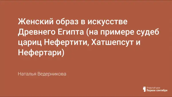 Урок посвящен особенностям искусства Древнего Египта на примере судеб цариц Нефертари, Хатшепсут и Нефертити. Судьбы великих женщин и их образы в искусстве Древнего Египта рассматриваются на уроке с использованием возможностей Интернета. Интересным ресурсом, которым воспользовались обучающиеся на уроке, - сетевая открытая энциклопедия Википедия.