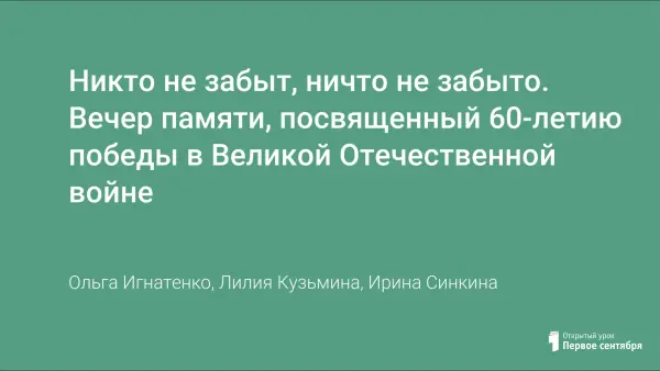 Вечер памяти, посвящённый 60-летию победы в Великой Отечественной войне, рассчитан на обучающихся 8-9 классов. Цель мероприятия - показать трагедию войны, напряжение в котором находилась страна, ужасы, с которыми столкнулись жители оккупированных территорий и пленные; дать почувствовать поколению, далёкому от войны, почему это "праздник со слезами на глазах". Поэтому в сценарии на первом плане не боевые действия, а жизнь гражданского населения в условиях войны, блокады, оккупации. Важной составляющей вечера является обилие хроники.