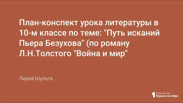 Цели урока - на материале романа раскрыть психологический процесс становления человеческой личности и её совершенствования; познакомить с теорией Л.Н. Толстого об истинной ценности человека, вовлечь учащихся в дискуссию; работать над развитием мыслительной деятельности учащихся, умением давать собственную оценку поступкам героев романа; воспитывать чувство уважения к людям неординарным, с богатым внутренним миром и отвращения к людям безнравственным, духовно нищим, лишённым способности развиваться; совершенствовать навыки работы над подготовкой сообщений (докладов) на литературную тему и продолжить работу по формированию навыка составления плана-конспекта.
