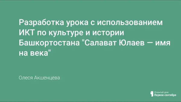 Данный урок разработан с использованием ИКТ. На уроке раскрывается тема образа главного героя башкирского народа Салавата Юлаева в литературе и искусстве, а также значение данного образа в истории народа. Использование ИКТ позволяет охватить большой объем материала за урок.