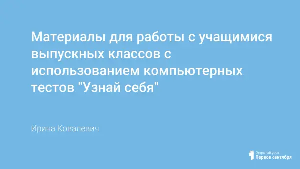 Материалы предназначены для работы по профориентации выпускников школы и призваны повысить эффективность работы классного руководителя в этом направлении. Работа с компьютерным тестом помогает определить круг специальностей, наиболее подходящих для данного человека. Обсуждение итогов тестирования позволяют задуматься о различных аспектах, влияющих на выбор профессии. К материалам прилагаются презентация по типам профессий и тест, созданный в MS Excel.
