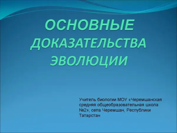 Цель урока – сформировать и раскрыть сущность основных доказательств эволюции. На уроке определяются основные доказательства развития органического мира; дается оценка биогенетического закона Ф.Мюллера и Э.Геккеля как эмбриологического доказательства; выясняется значение для науки ископаемых переходных форм как палеонтологических доказательств, изучаются биогеографические доказательства эволюции.