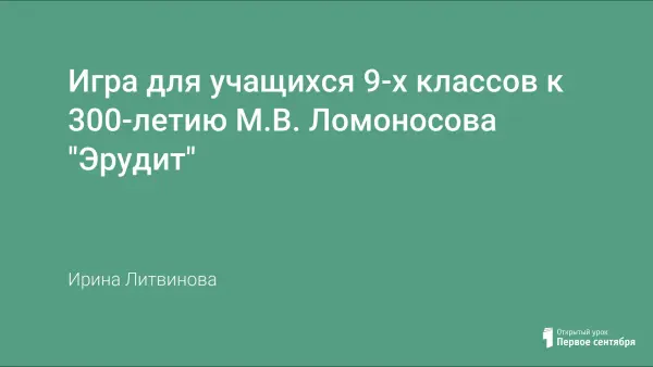 "Эрудит-игра" для учащихся 9-х классов посвящена биографии М.Ломоносова. Цель игры - обобщить и углубить знания учащихся о научной деятельности ученого в области географии.