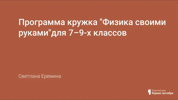 Программа кружка "Физика своими руками" является авторской учителя физики Ерёминой Светланы Николаевны. Главной целью является развитие способностей детей в области научно-технического творчества. Программа рассчитана на три года обучения и представляет собой единый курс теоретических вопросов и подготовки учащихся к самостоятельной исследовательской и конструкторской работе. Она позволяет не только развивать творческие способности, но и помогает более глубокому осознанию и усвоению программного материала на уровне применения знаний в новых условиях.