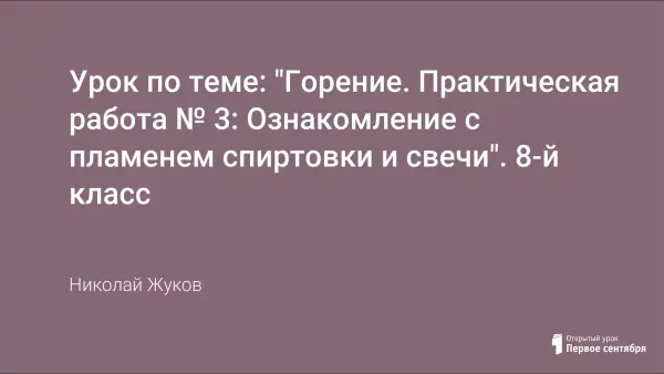 В данной статье представлена разработка открытого урока, на котором учащиеся знакомятся с процессом горения и закрепляют свои знания во время выполнения практической работы. Урок включает следующие разделы: проверка знаний, объяснение нового материала, практическая работа.
