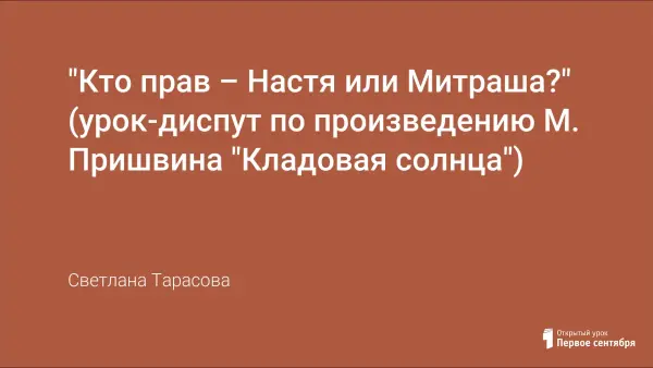 Урок–диспут по произведению М.Пришвина «Кладовая солнца» проводится в 6 классе и представляет собой форму дискуссии, которая позволяет организовать живое общение, вовлечь всех или большинство учащихся в обсуждение вопроса, предполагает напряжение мысли, возникающее в раздумьях, в столкновениях различных точек зрения, стимулирует речевую активность и самостоятельность суждений. Такая форма урока позволяет обратить внимание на культуру речевого общения во время спора, на умение спокойно выслушивать доводы оппонента и ясно излагать свою точку зрения.