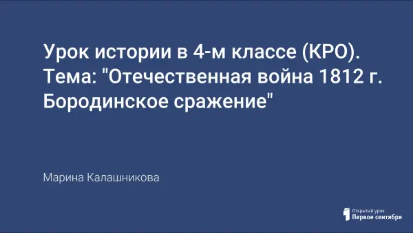 Урок истории в 4-м классе, цели которого: на основе эвристической беседы, исследования карт, схем, материала учебника с последующим анализом и рассуждением подвести учащихся к выводам о роли Отечественной войны 1812 года и историческом значении Бородинской битвы; определить характер войны как справедливой войны народа за свободу и независимость.