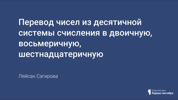 Представлена разработка урока по модели организации смешанного обучения «Смена рабочих зон». Цели урока: сформулировать правила перевода десятичных чисел в двоичную, восьмеричную и шестнадцатеричную системы счисления; научить осуществлять перевод чисел из десятичной системы счисления в двоичную, восьмеричную, шестнадцатеричную.